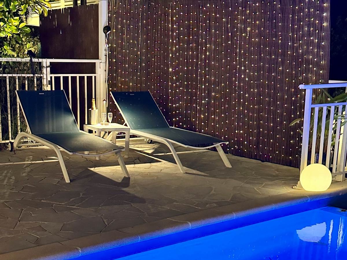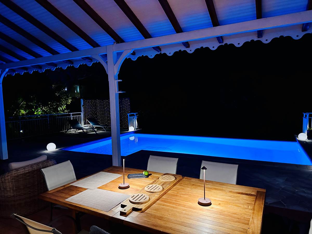 À la tombée du jour, la villa se transforme. Les jeux de lumière mettent en valeur l'architecture contemporaine et les reflets de la piscine créent une atmosphère chic et feutrée. Un verre à la main, on profite du calme et de la douceur du soir, bercé par la brise tropicale. Un moment suspendu entre luxe discret et sérénité.