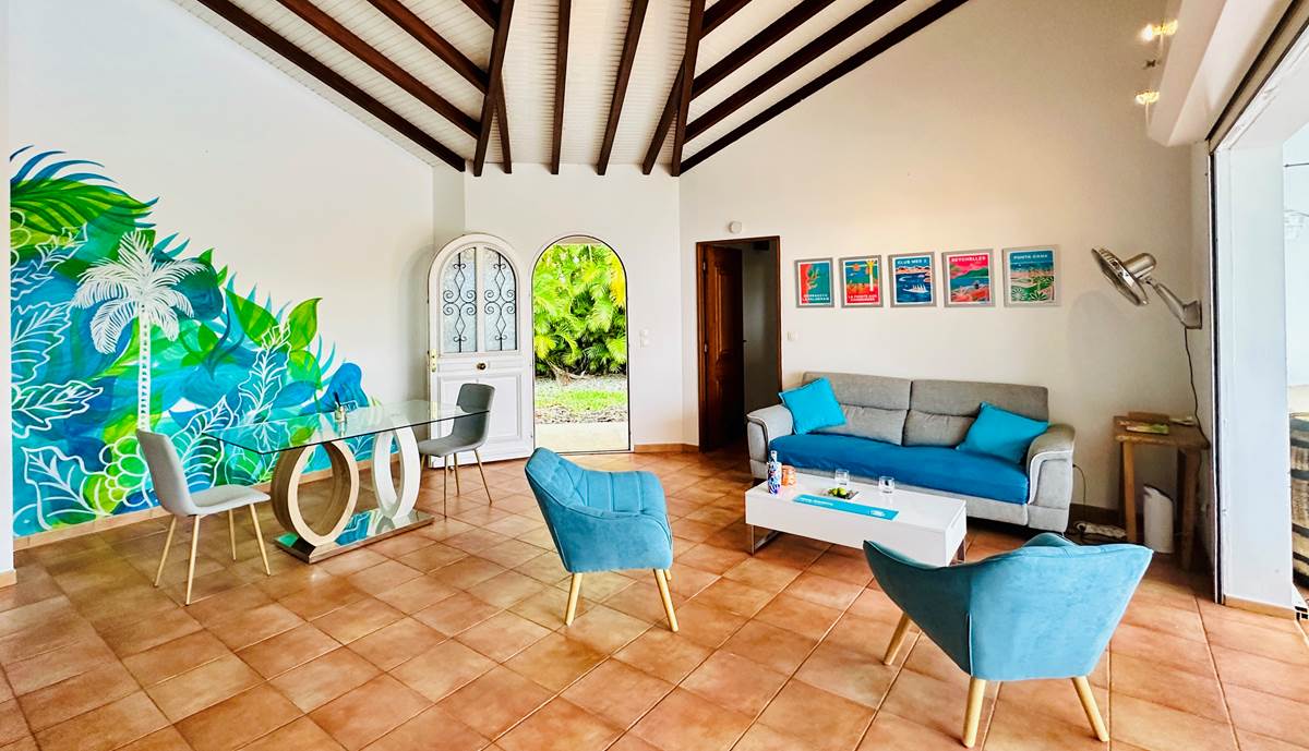 Le salon est spacieux, décoré avec goût, doté d'un grand canapé, d'une télévision connectée et d'une fresque murale tropicale peinte à la main.